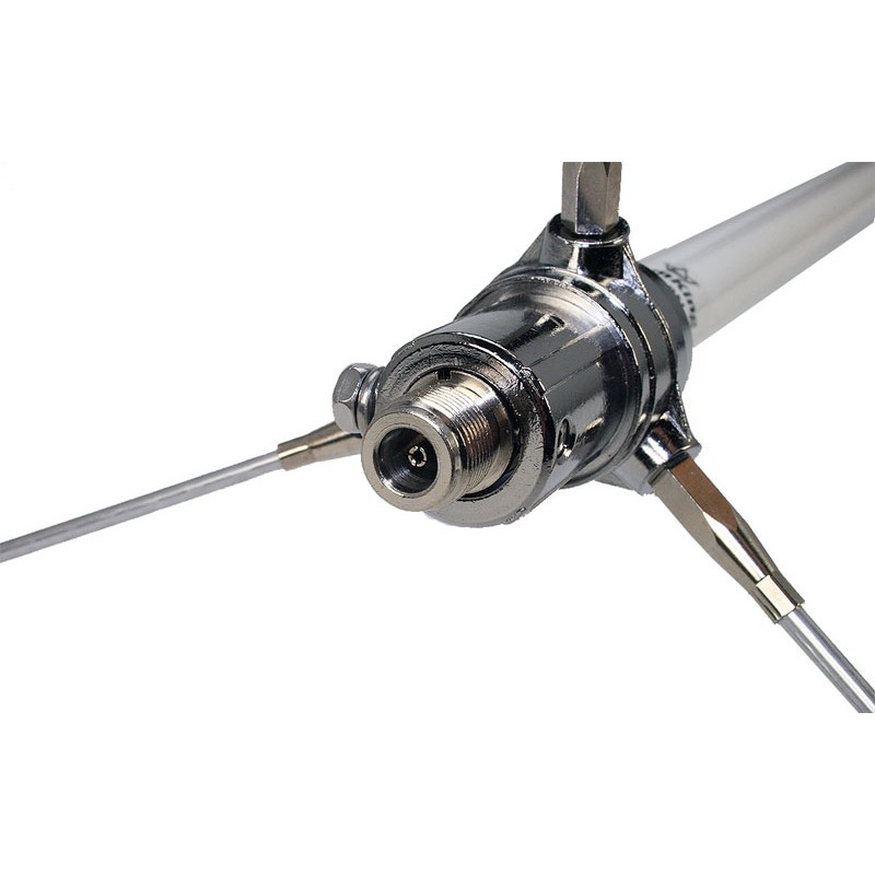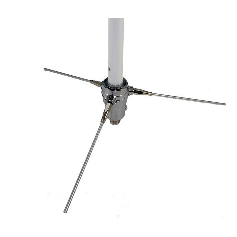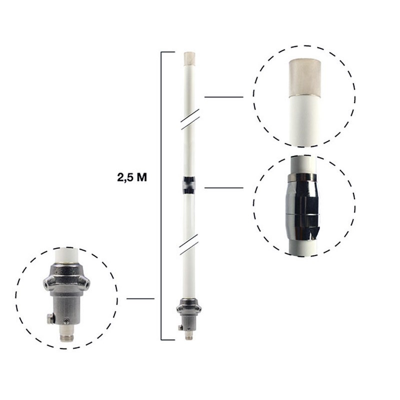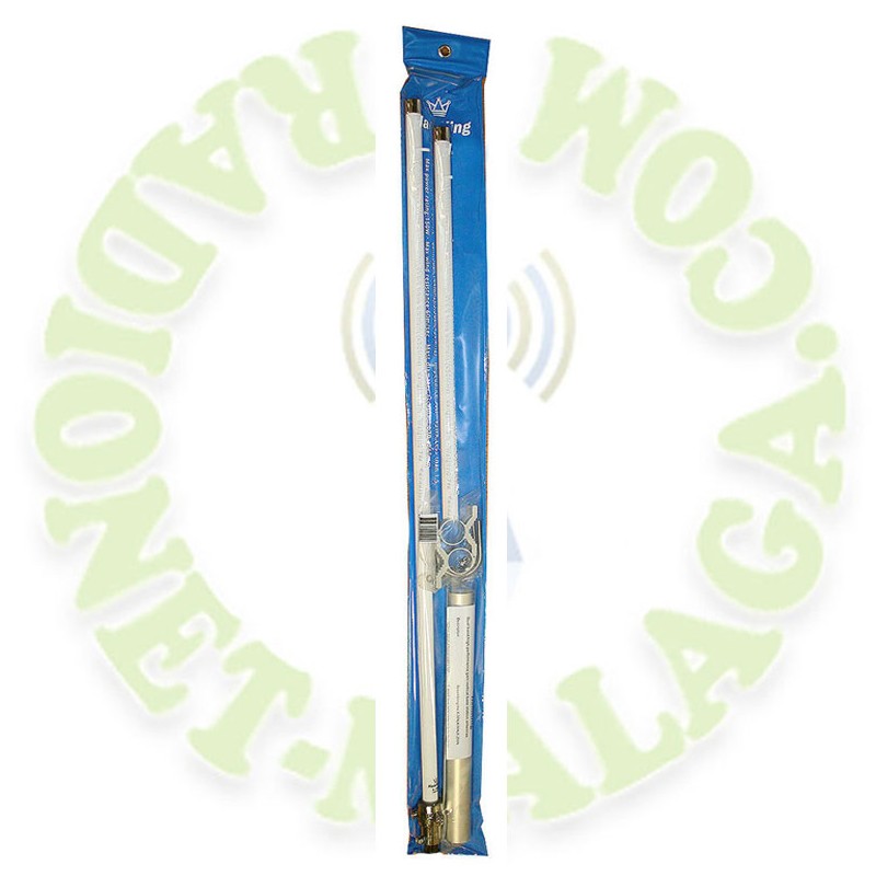 La antena vertical HamKing V-2000N-2 para 50 MHz (ganancia de 2,15 dBi), 144 MHz (ganancia de 6,2 dBi) y 430 MHz (ganancia de 8,4 dBi) consta de una construcción de varilla de fibra de vidrio, que se entregará preajustada y totalmente Resistente a la intemperie. Se incluyen los soportes de montaje del mástil. Equipado con un conector 'N' de baja pérdida para un mejor rendimiento. Potencia máxima: 150 vatios. Longitud 2,5 mts en dos tramos.