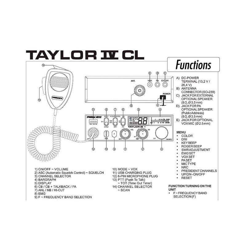 La President Taylor IV Carbon Line es una emisora móvil para banda ciudadana (CB) en 27 MHz, diseñada para ofrecer alto rendimiento con un diseño moderno y compacto. Incluye un micrófono con acabado efecto carbono y múltiples funciones avanzadas que optimizan la experiencia del usuario tanto en carretera como en estaciones móviles. La Taylor IV Carbon Line cuenta con modos AM/FM, múltiples bandas seleccionables, y compatibilidad con 12/24 V, lo que la hace ideal para su uso en una amplia gama de vehículos. Su pantalla LCD multifunción y el sistema ASC (Control Automático de Silencio) garantizan una operación sencilla y efectiva en cualquier entorno.